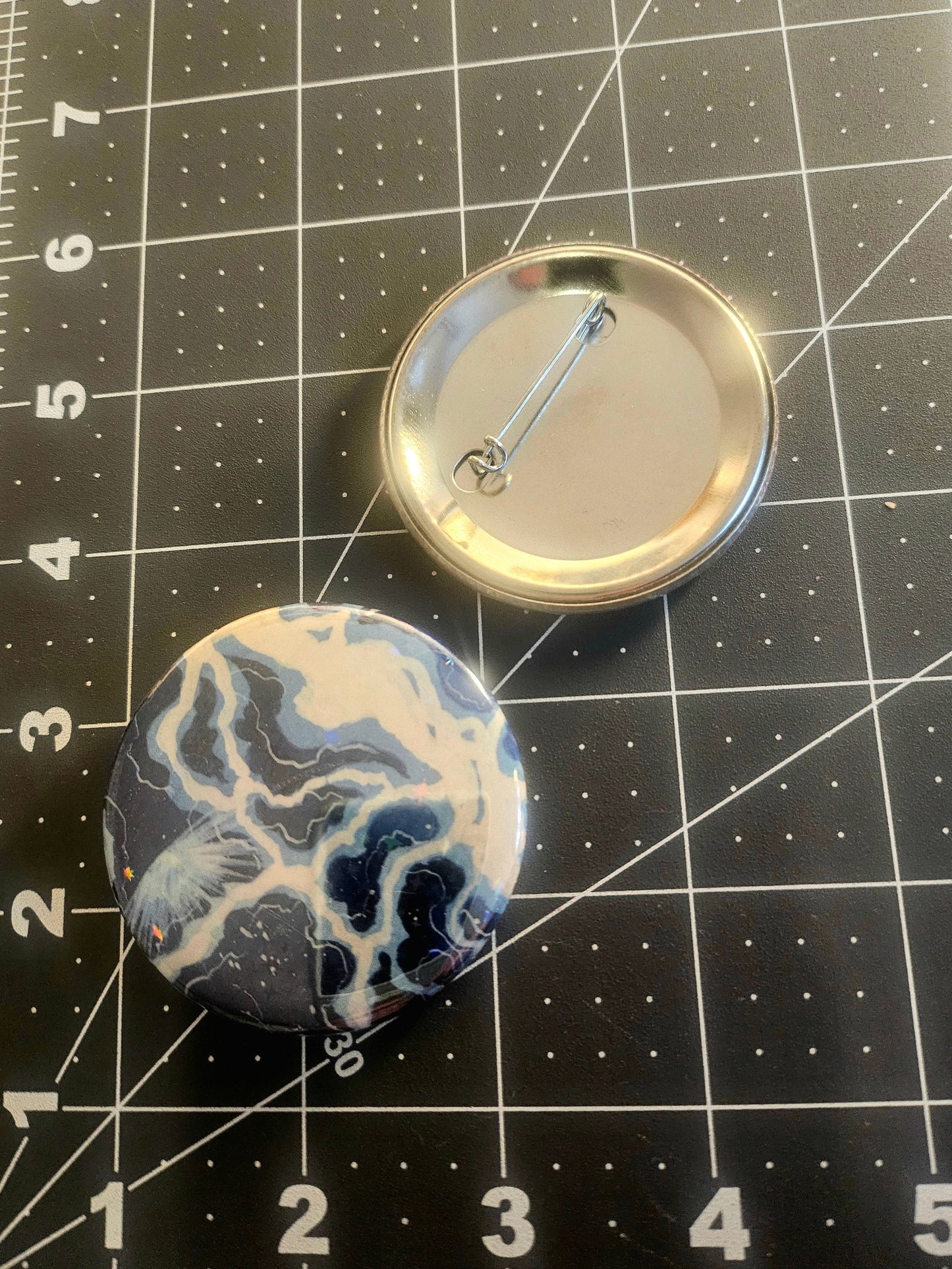 Upcycled magazine image and ABM pinbacks with a mylar cover. Some buttons contain glitter or holographic film flourishes